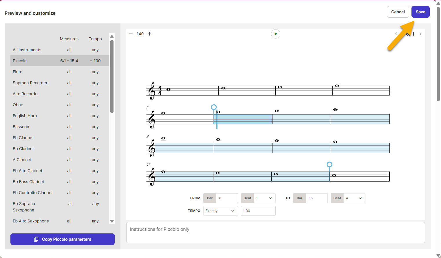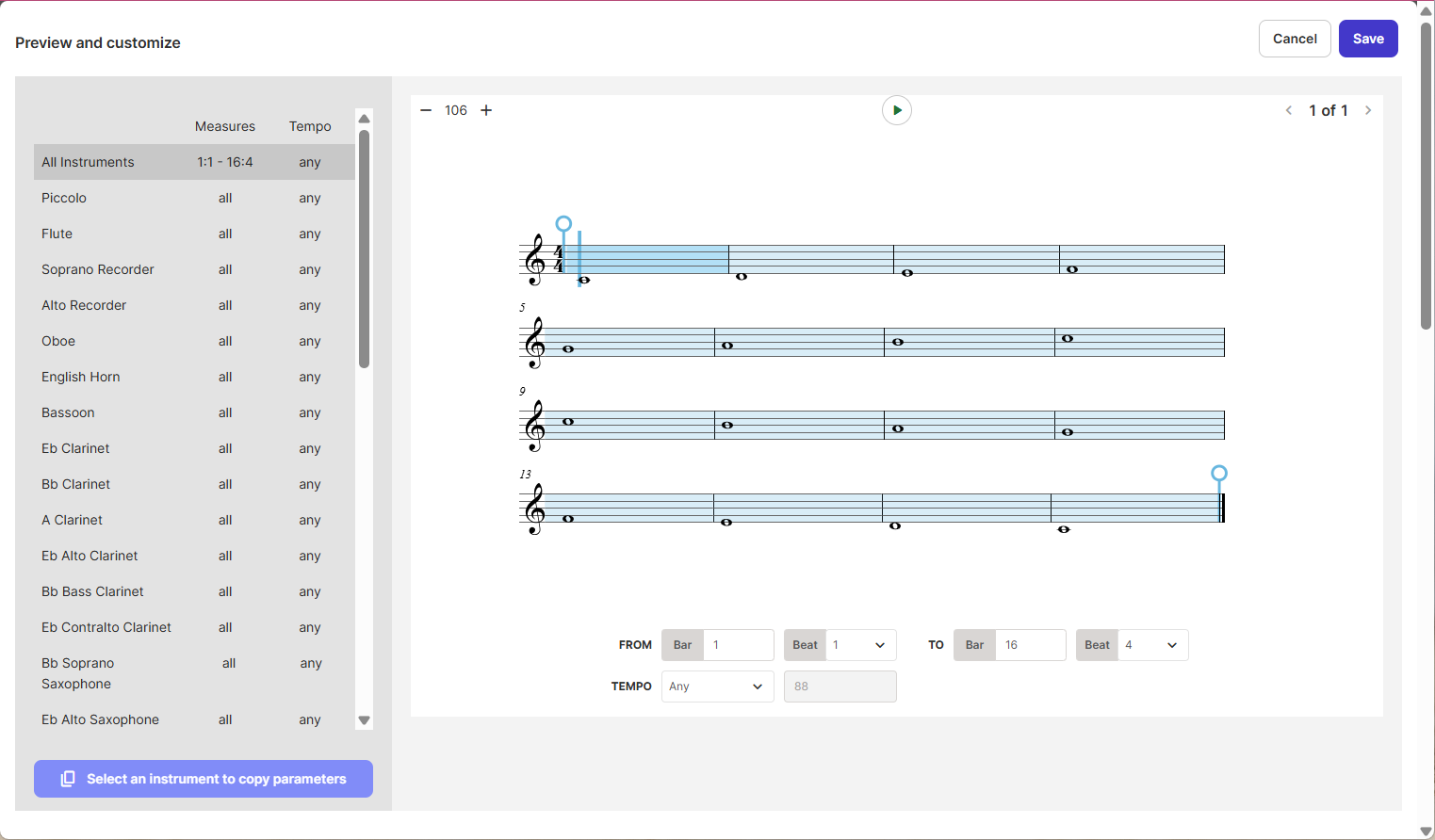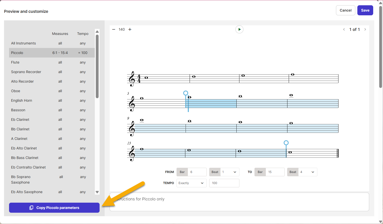 You can define the tempo, as well as the starting and ending measures for the assignment. Additionally, you can provide specific instructions per instrument. These parameters can all be set for each individual instrument, or you can apply custom specifics to all of the parts by setting them for one instrument, then selecting the Copy parameters from (part name) button.