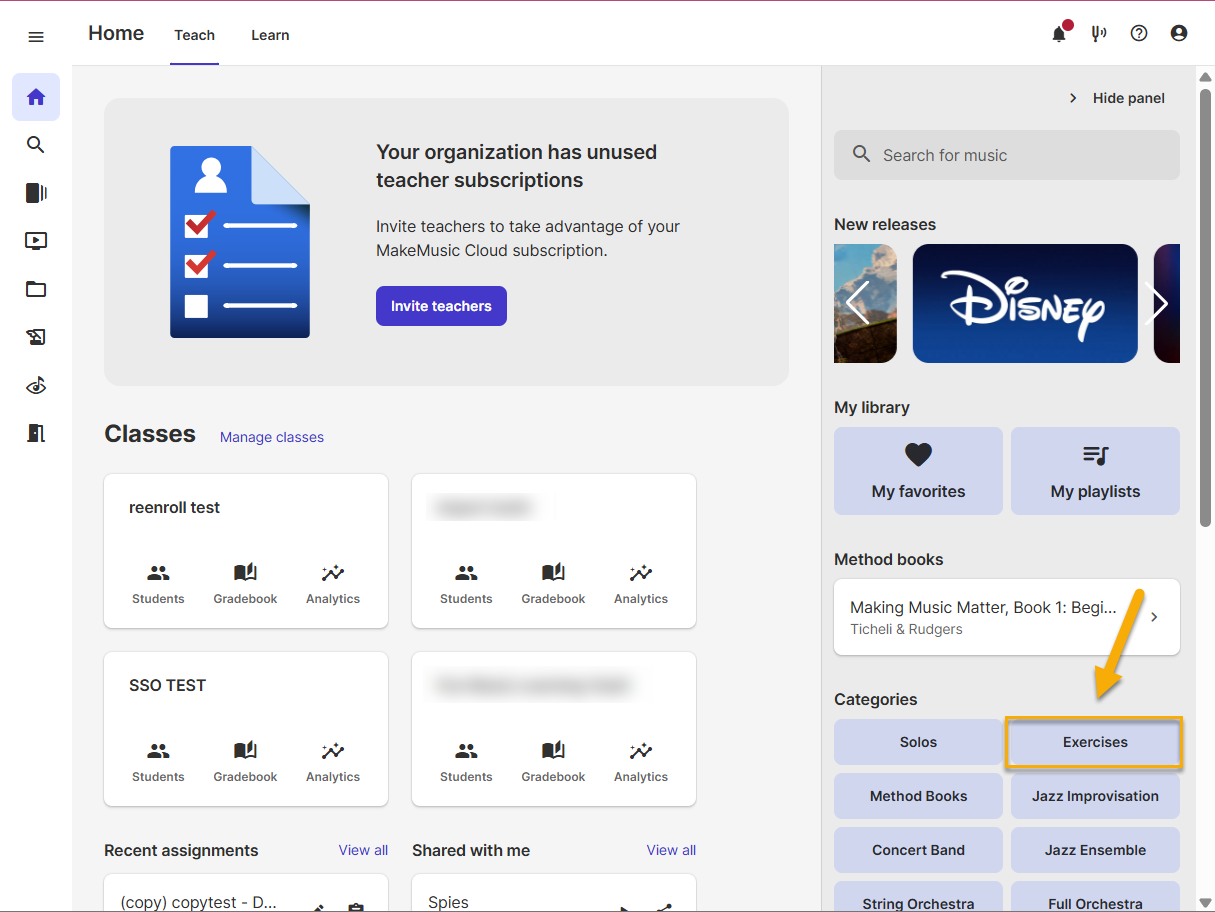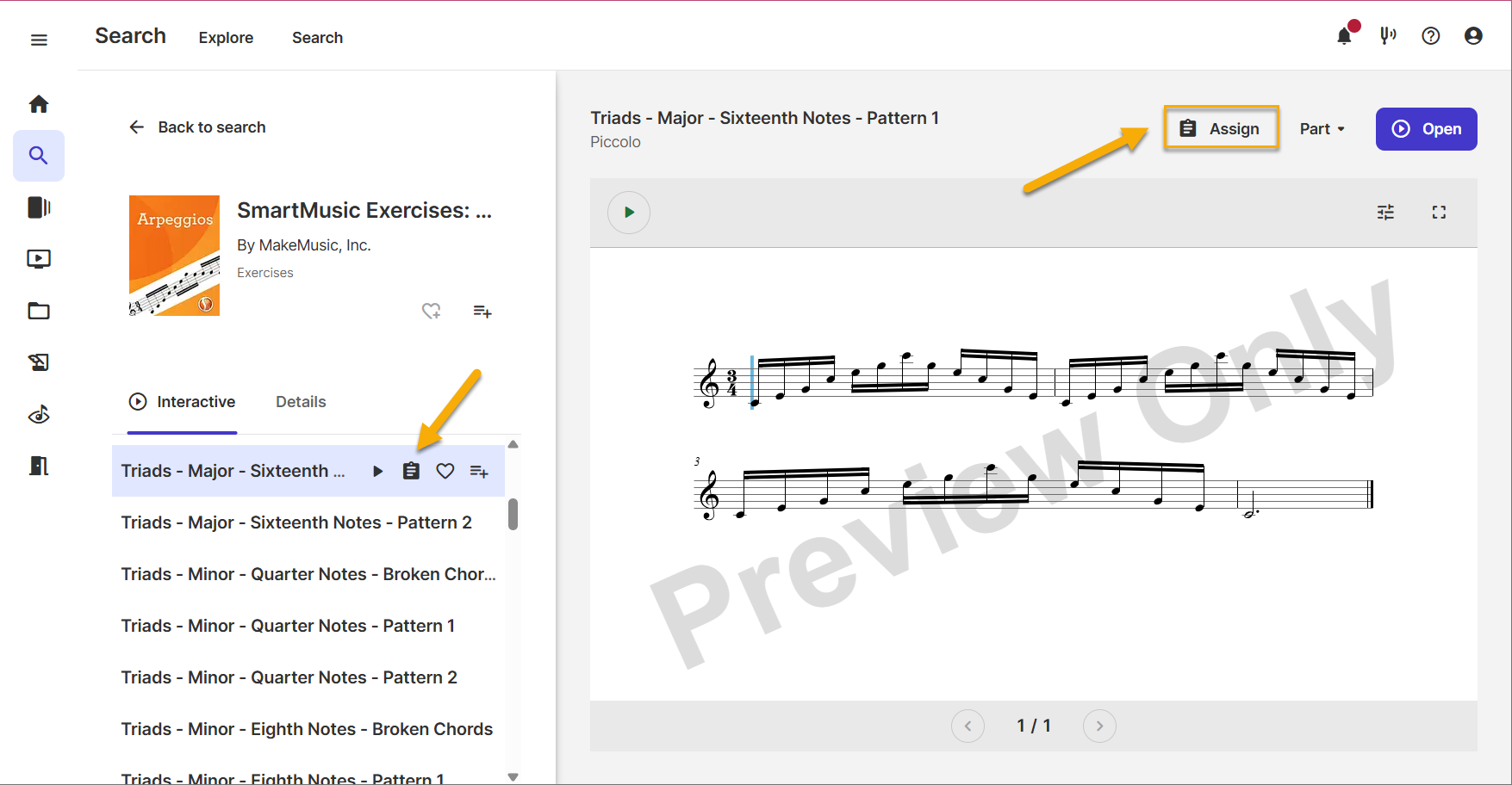 Choose an exercise type (e.g. "Arpeggios"). A list of exercises appears on the left side of the screen. Choose the exercise you would like to assign and then select the icon or Assign.
