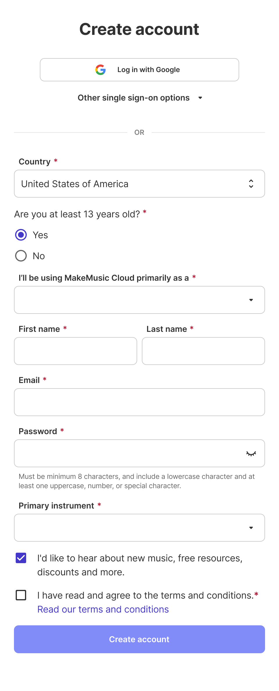 Enter your email and create a Password. Use the drop-down menu to select a Primary Instrument, (required).
